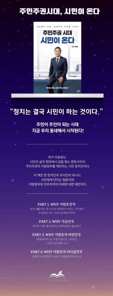 안녕하세요, 삶을 기록하고 걷고 변화를 만들어가는 사람들의 출판사 시너지북스입니다. 이번 달에도 당신의 이야기, 그리고 우리가 함께 만드는 변화의 순간들을 소개합니다. 작가의 출간 소식 알차게 준비했어요. 📚 출간 소식 『주민주권시대, 시민이 온다』는 위기의 민주주의 시대에 “정치는 누구의 것인가”라는 근본적인 질문을 던지는 책이다. 저자 이원호는 민주주의가 제도에 머무르지 않고 삶 속에 뿌리내리기 위해서는 주민이 지역의 진정한 주인이 […]